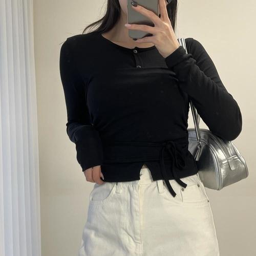 [옷자락]여자 리본 셔링탑 레이어드 라운드 긴팔 가디건 세트
