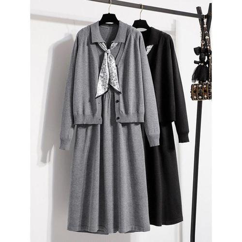 행복여 아르 투톤 레이어드 니트 가디건 브이넥 원피스 세트