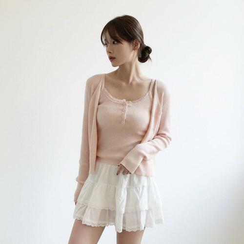 [미라클세븐]여성 브이넥 레이스 버튼 나시 골지 가디건 세트