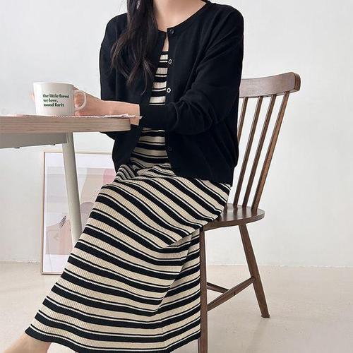 [신상오픈런]여성 스트라이프 유넥 민소매 니트 롱 원피스 가디건 세트