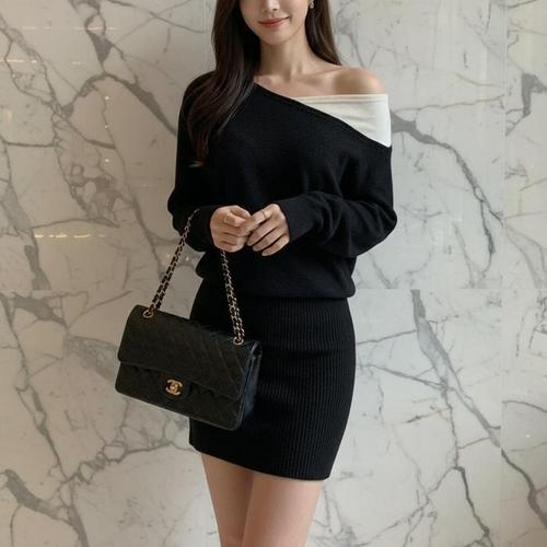 [옷자락]여성 언밸런스 오프숄더 가오리 니트 미니 배색