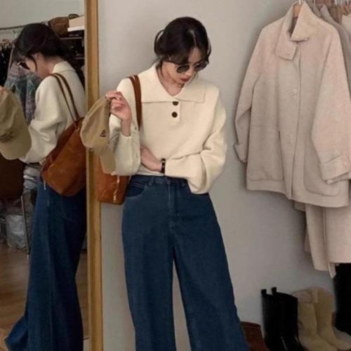 달콩 여성 가을니트 라운드넥 버튼넥 우드버튼단가라니트
