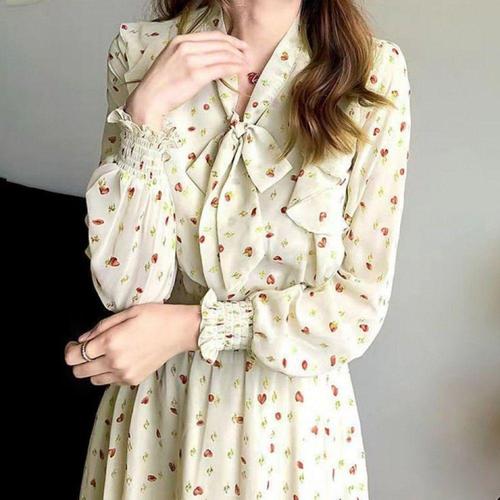 [오너클랜]인기상품 가을용 슬림핏 쉬폰 플라워 리본 긴팔 롱 드레스 [WFLL9N4_260304]