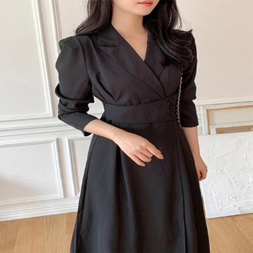 POMTOR 가을 여자 슬림핏 정장넥 긴팔 A라인 원피스 허리 조임 스커트