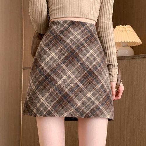 [다잇템]여자 격자 갈색 FW 하이웨이스트 미니스커트 (25426274A)