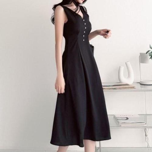 [다잇템]여성용 검정 V넥 진주단추 슬리브리스 드레스