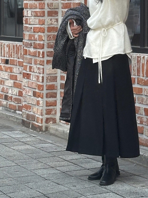 [옷자락]여자 a라인 플리츠 맥시 큐롯 검정색 플레어 롱스커트