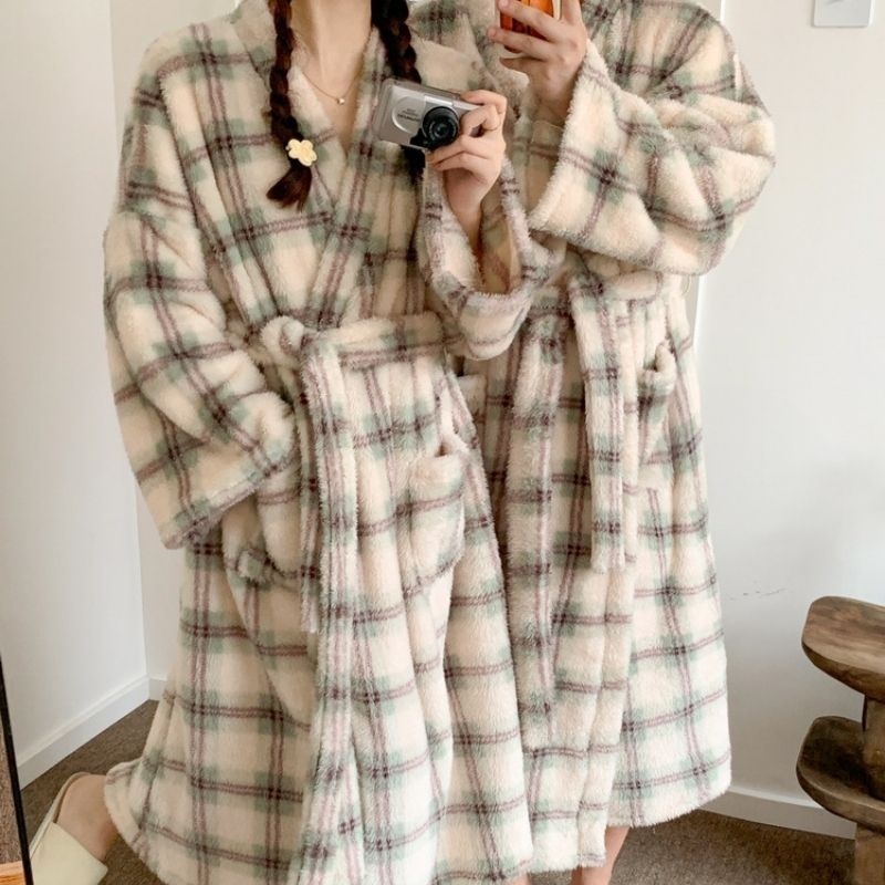 커플 브리즈 체크 극세사 수면 잠옷 가운 1color