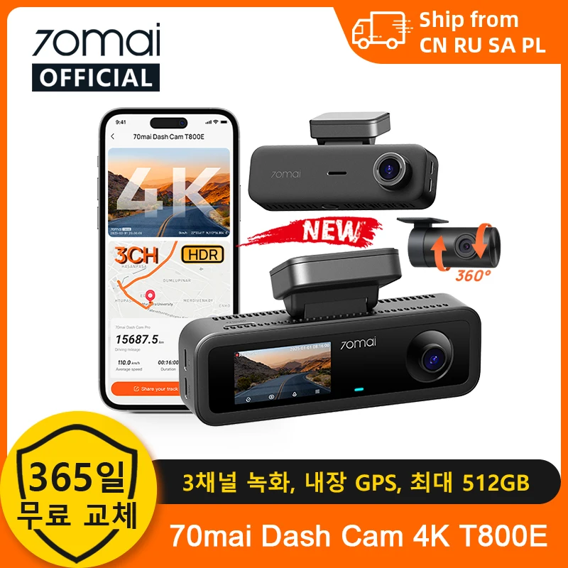 70mai 4K T800E 3채널 블랙박스 전방 후방 실내 3 in 1 음성 제어 지원 24시간 주차 슈퍼커패시터 GPS 4K 차량용 DVR