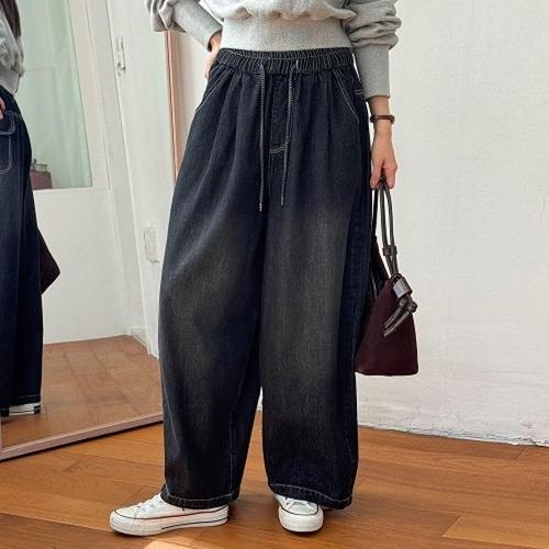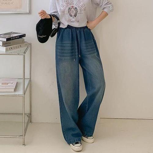 [다잇템_패션]여자 FW 워싱진 고무줄 면원단 박시 청바지