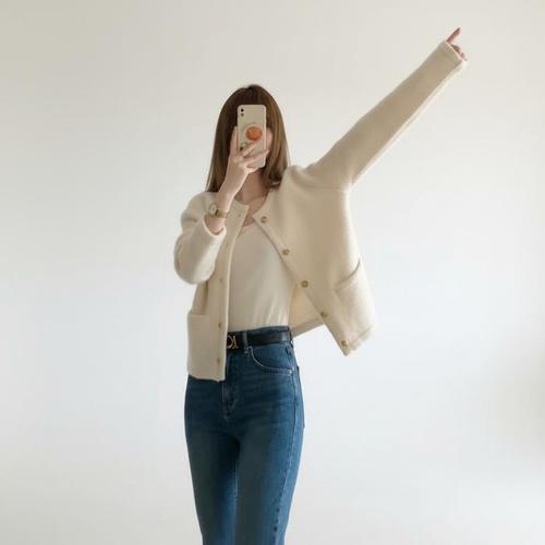 [신상오픈런]여성 소프트 폴리 노카라 골드 버튼 크롭 가디건 (46198989)