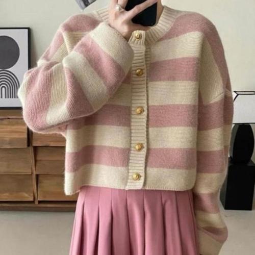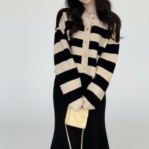 [신상오픈런]여성 빈티지 스트라이프 골드 버튼 크롭 니트 가디건 (46198987)