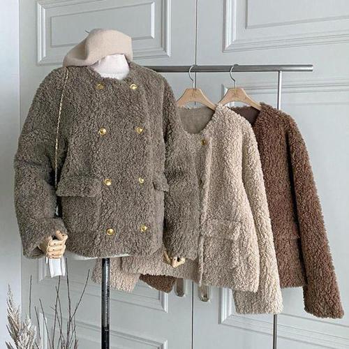 [신상오픈런]여성용 캐주얼 골드버튼 노카라 퍼 자켓