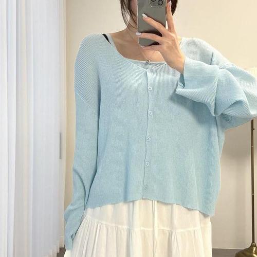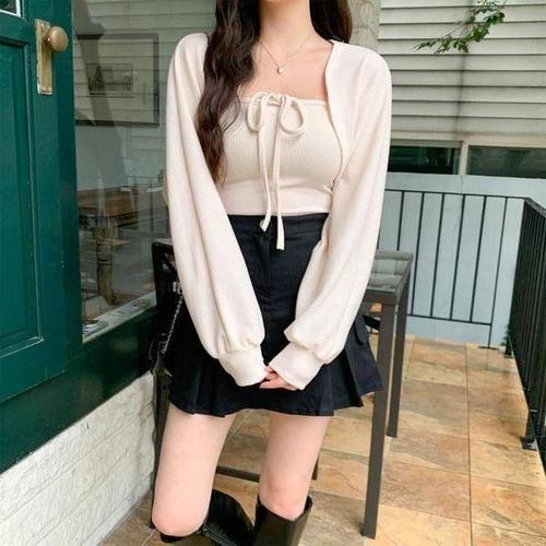 [옷자락]여자 여리여리 골지 끈나시 니트 박시핏 가디건 세트