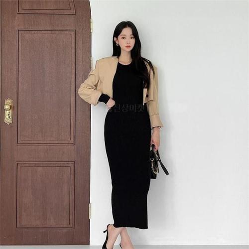 [옷은날개] 골지 니트 소재 목폴라 슬림 일자핏 롱 원피스