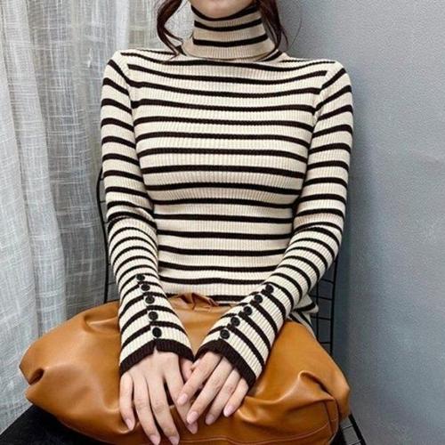 [엄지척]여성 스트라이프 패턴 소매 단추 목폴라 골지 니트티_19558691_667501