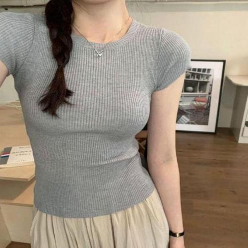 신축성 좋은 여성 라운드넥 반팔 골지 니트 티셔츠 WE25599