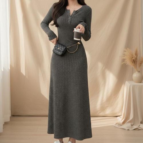 마쿠쿠 라운드넥 단추 골지 슬림 긴팔 여성 A라인 롱 니트 원피스