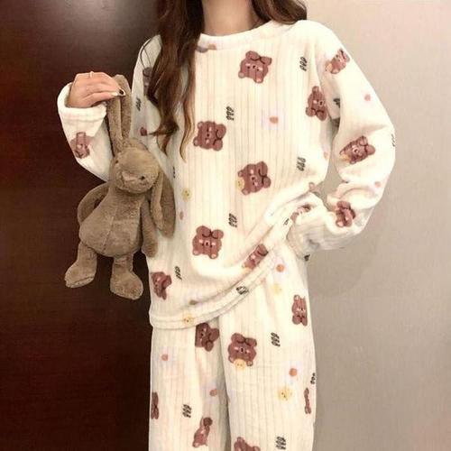 곰돌이 수면 잠옷 세트 극세사 겨울 실내복 우정 파자마 동물 캐릭터 중학생 주니어 성인 여성 두꺼운 홈웨어
