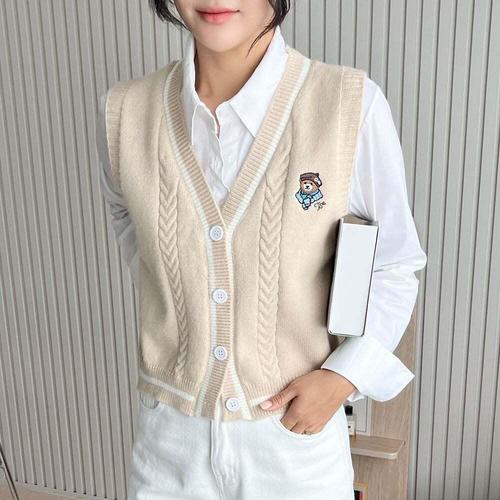 [엄지척]여성 3컬러 모자곰 오픈 단추 브이넥 니트조끼 가디건_20358233_667501