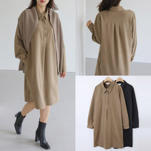 [옷자락]여자 하객룩 카라 퍼프 소매 버튼 H라인 미디 원피스_4