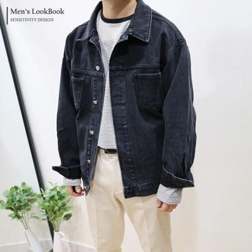 [맨즈북]남녀공용 스톤워싱 오버핏 흑청데님자켓 트러커
