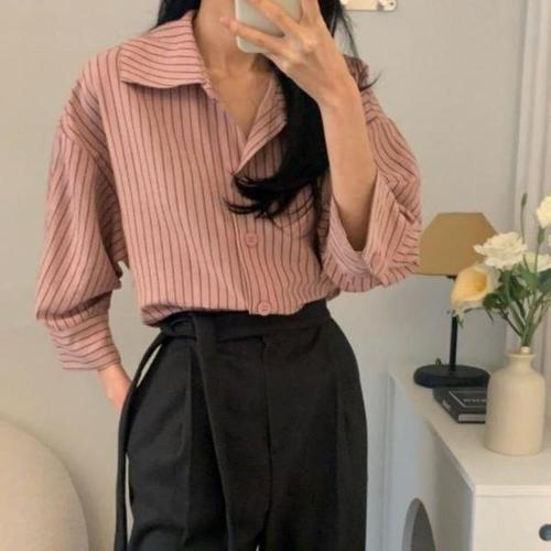[신상오픈런]스트라이프셔츠 여성 올리브그린 봄코디 팔부남방