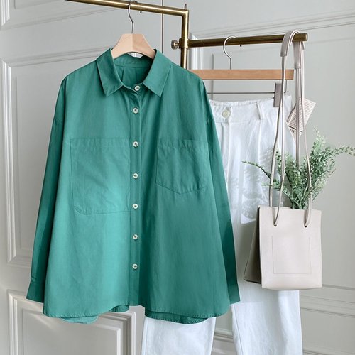 여성 카라넥 포켓 언발 무지 면100 간절기 남방 셔츠 DGB-WBL-4118-그린
