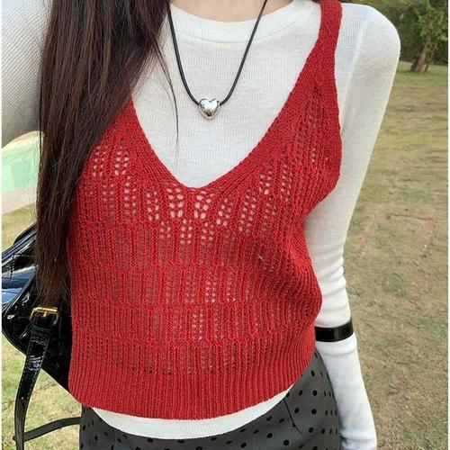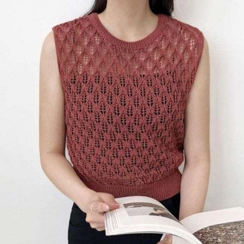 펀칭 민소매 니트 조끼 여성용 여름 루즈핏 레이어드 날씬해 시원한 라운드넥 얇은 데일리 티셔츠