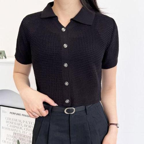 [에이치플러스몰]여자 카라넥 그물망 단추 반팔 니트