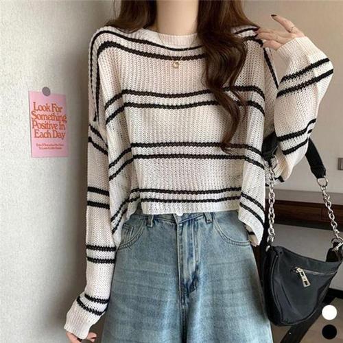 [에이치플러스몰]여름 블랙 그물 긴팔 루즈핏 스트라이프 시스루 크롭