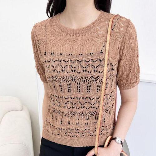 [에이치플러스몰]여성 여름 데일리 라운드넥 시스루 펀칭 그물 반팔 니