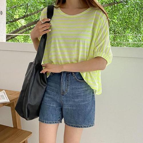 [다잇템]여자 고무줄 기모노핏 형광 줄무늬 반팔티 (11036014A)
