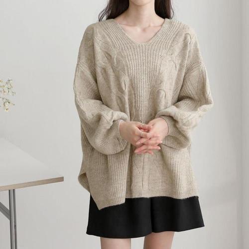 [다잇템]여자 꽈배기 브이넥 박시핏 기모노핏 슬릿 니트 (11035069A)