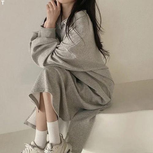리파니 루즈핏 맨투맨 옆트임 기모 후드 롱 원피스