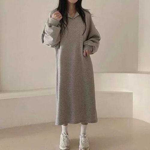 [엄지척]루즈핏 여성 클랜 기모 후드 롱 긴팔 캐주얼 원피스_19803639_667501