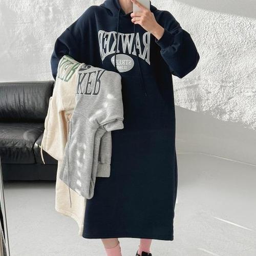 플러리싱 / 기모 후드 레터링 루즈핏 롱 원피스 플러리싱