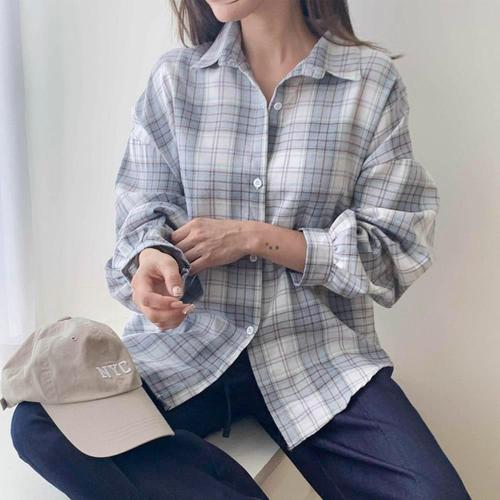 샵앤) 여성 카라넥 약기모 루즈핏 체크 언발 남방 셔츠 MSE-WBL-20791-네이비