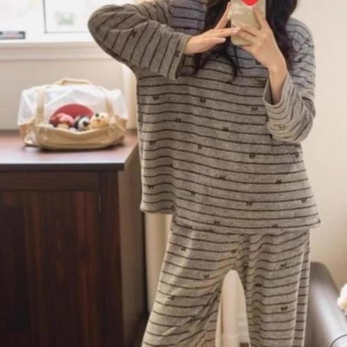 [신상오픈런]여성 루즈핏 라운드넥 기모 스트라이프 리본 잠옷 세트 (45726791)