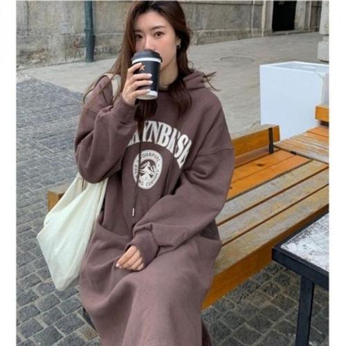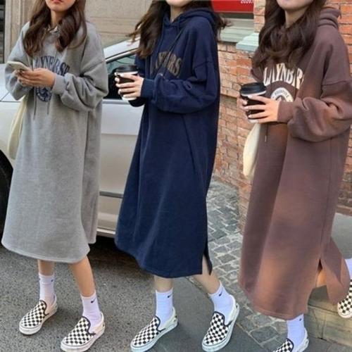 [옷자락]여성 캐주얼 루즈핏 두툼 기모 후드 긴팔 원피스