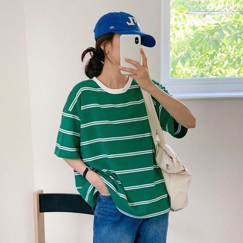 [유야]캐주얼 단가라 라운드 반팔 롱 티셔츠 스트라이프 기본티 박스티 -TS0501H- 빅사이즈 루즈핏 여성 ..