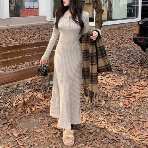 여성 긴팔 니트 슬림A라인 롱 원피스 WFKQAIC