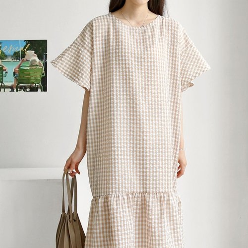 깅엄체크 라운드 벨소매 등원룩 데일리 반팔 롱 원피스 ARA-WDR-3369-베이지