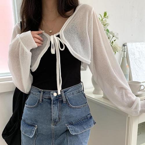 [다잇템]여자 슬리브리스 숏가디건 스웨터 망사 세트 (10437090A)