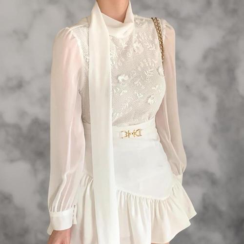 [옷자락]여성 가을 하객룩 시스루 꽃무늬 리본 블라우스