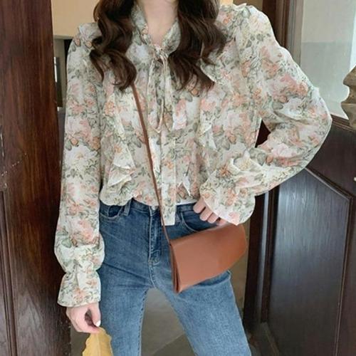 [엄지척]여성 리본 꽃무늬 플라워 프릴 긴팔 블라우스_19649399_667501