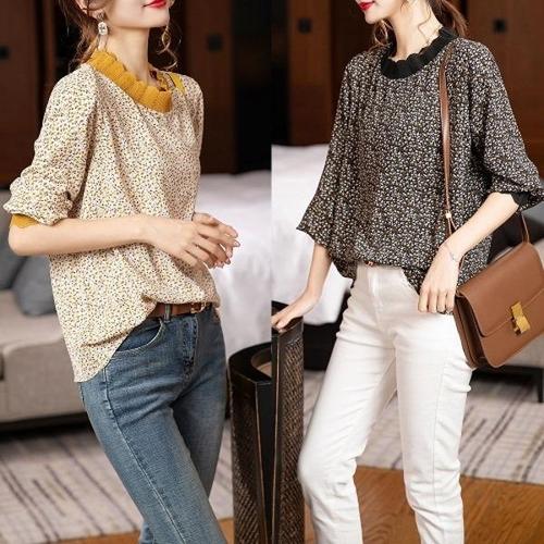 지고다그 여성 여름 쉬폰 7부소매 블라우스 브이넥 루즈핏 꽃무늬 셔츠 SX69784