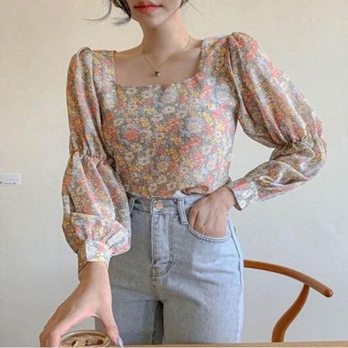 [엄지척]스퀘어넥 플라워 패턴 꽃무늬 퍼프소매 블라우스 셔츠_19643048_667501