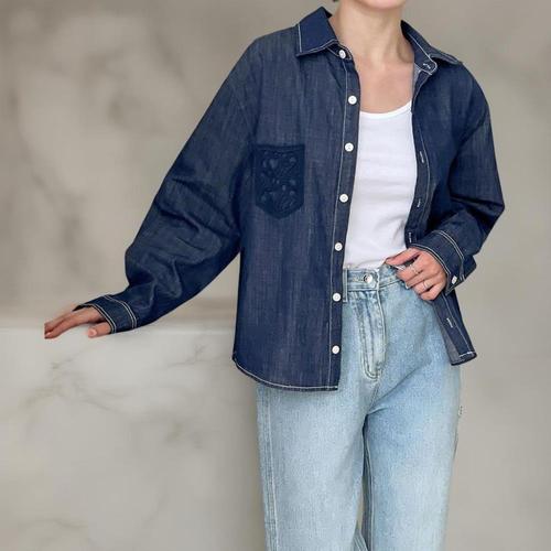 [다잇템]여성 카라넥 꽃무늬 자수 주머니 진청 셔츠