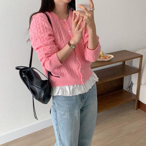 [옷자락] 여성용 부드러운 아크릴 꽈배기 라운드넥 가디건